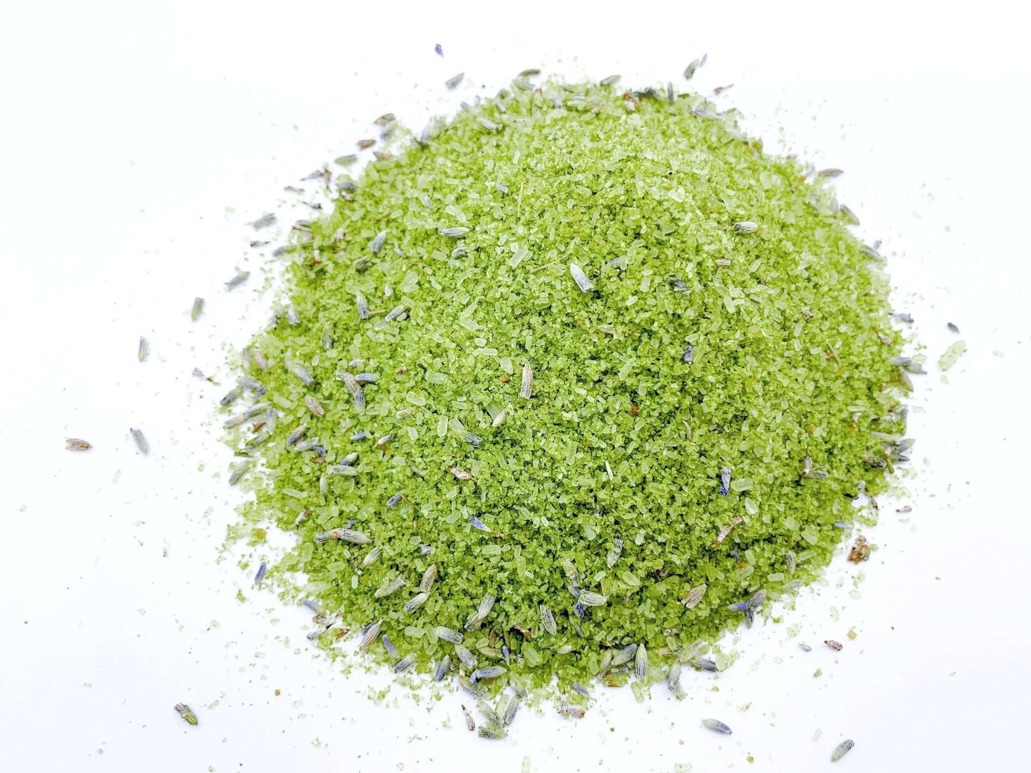 Ingredients: Epsom Salt, Pink Himalayan Salt, Dried Coconut Milk, Kaolin Clay, Matcha Green Tea Powder, Sweet Almond Oil, Vitamin E Oil, Lavender Essential Oil, Lemongrass Essential Oil, Dried Lavender Buds