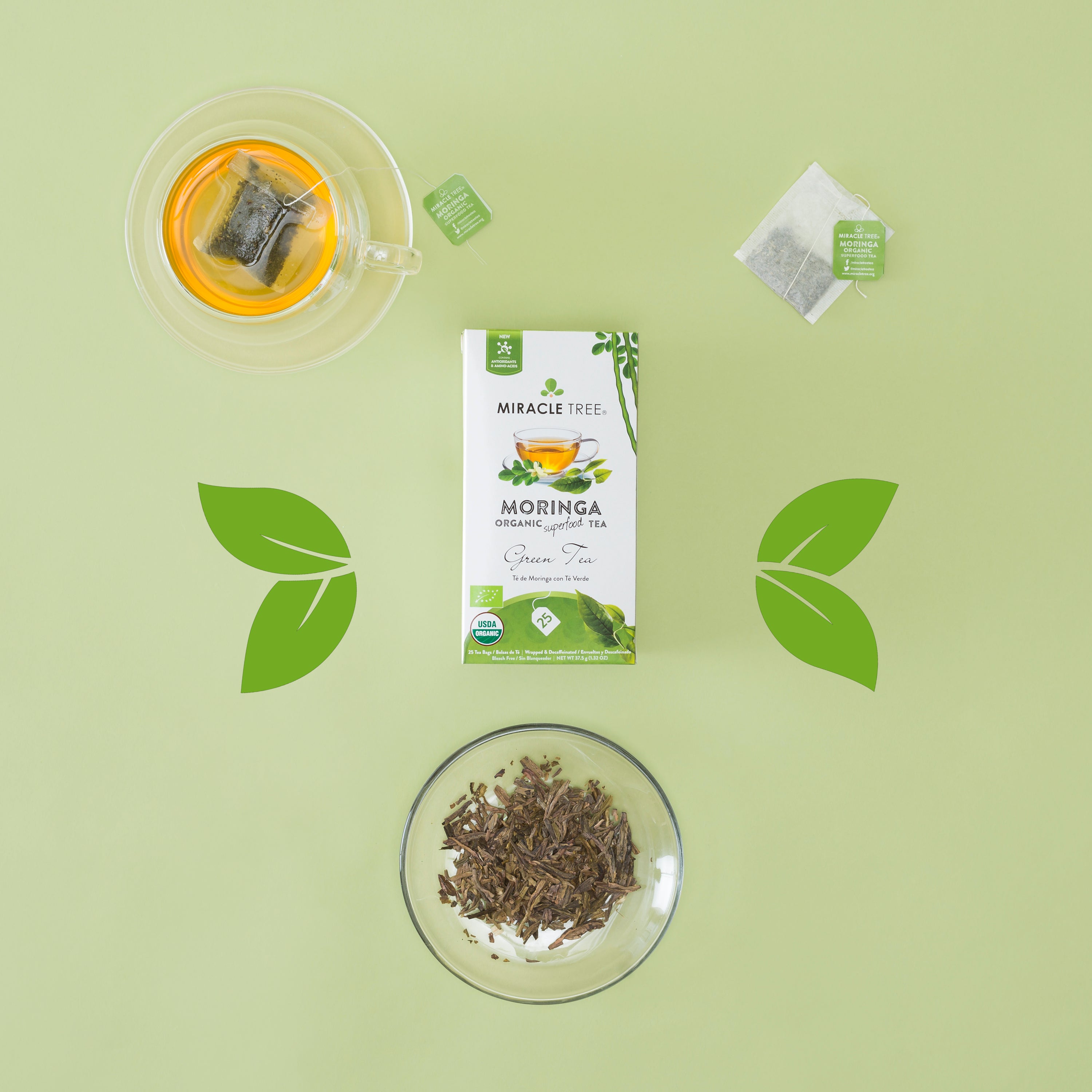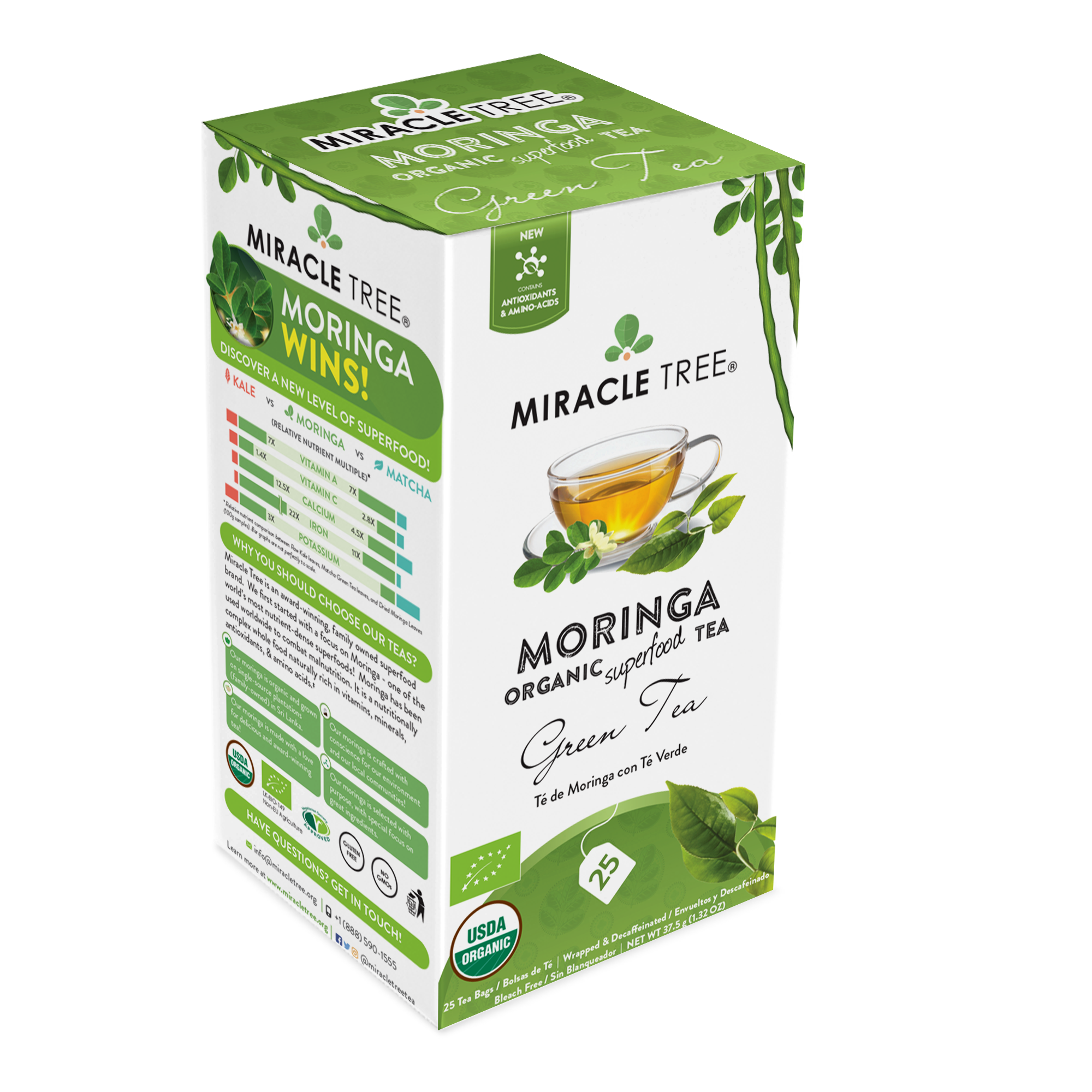 25 WRAPPED TEA BAGS, ORGANIC MORINGA LEAF, NON-GMO, DECAFFEINATED, & ABSOLUTELY DELICIOUS. ORGANIC MORINGA TEA, GREEN TEA: Miracle Tree's Green Tea & Organic Moringa Superfood Tea is a super infusion combines fresh and organic Moringa dried leaves blended with the highest quality Green Tea leaves making it a truly ideal addition to your daily routine.