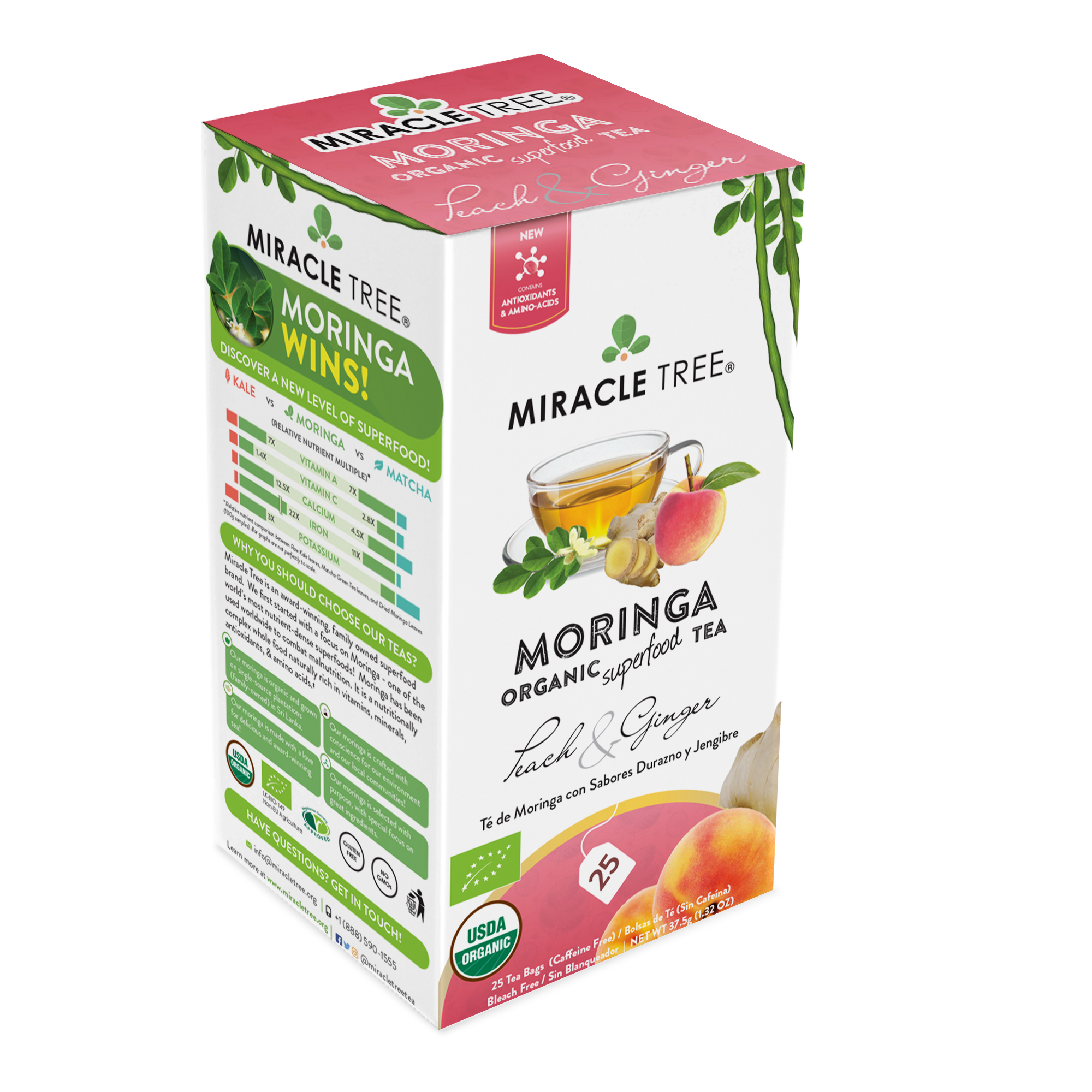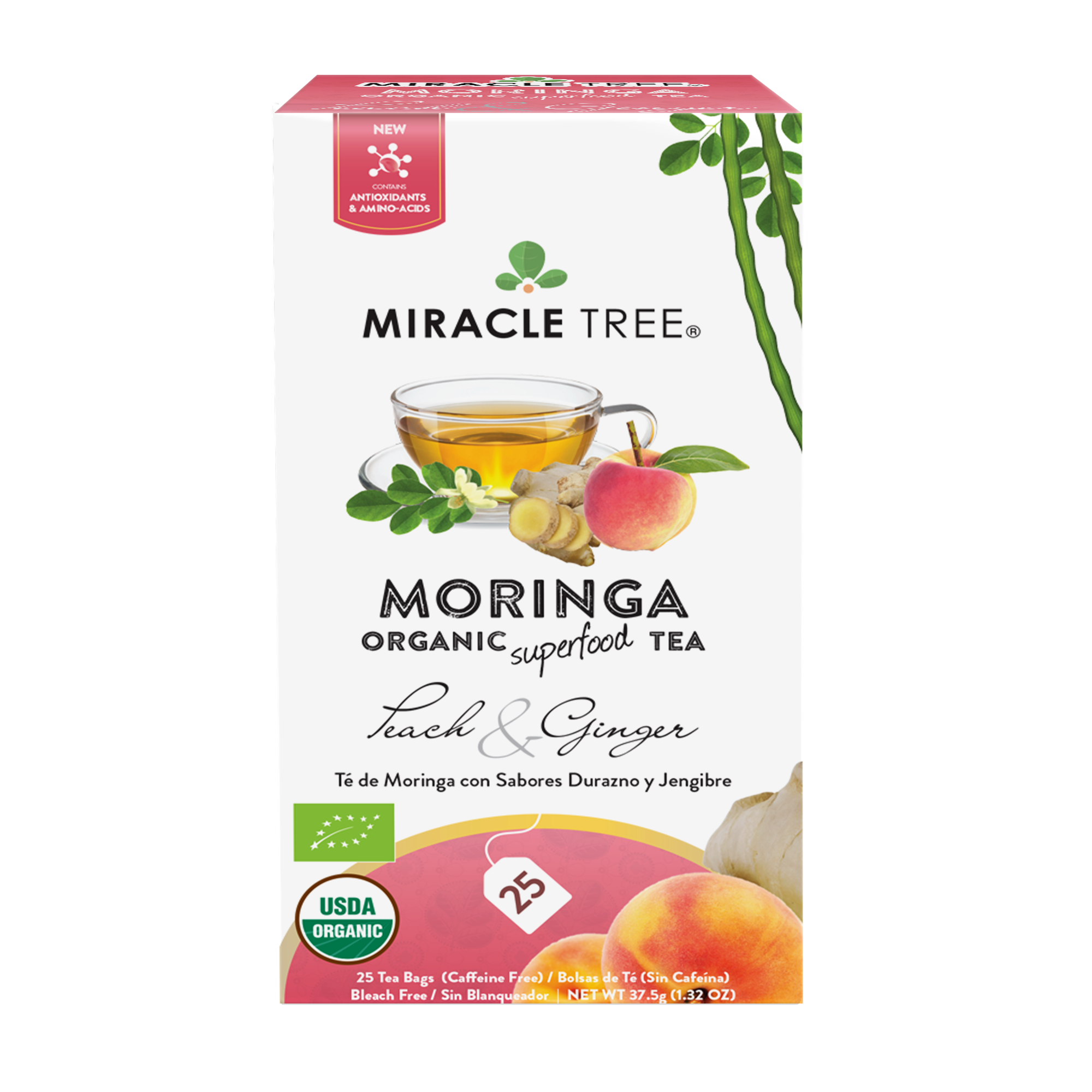 25 WRAPPED TEA BAGS, ORGANIC MORINGA LEAF, NON-GMO, CAFFEINE-FREE, & ABSOLUTELY DELICIOUS. ORGANIC MORINGA TEA, PEACH & GINGER: Miracle Tree's Peach & Ginger Organic Moringa Superfood Tea delightfully combines the irresistible flavors of fresh peach with fresh ginger, and the superfood qualities of Moringa. It tastes so good you'll want to drink it every day.